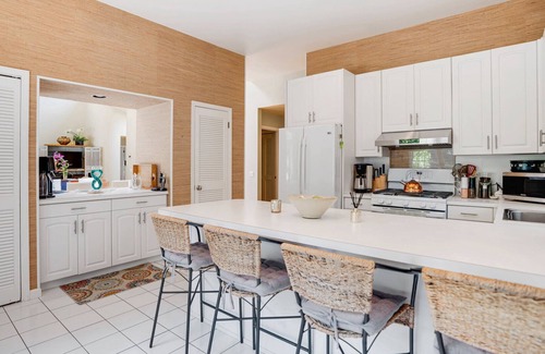 The three bedrooms offer a restful and refined experience, each with fresh linens and thoughtfully designed spaces. The primary suite features a king bed, French doors that open directly to the pool deck, and a luxurious ensuite bathroom with a soaking Jacuzzi tub and walk-in shower. The second guest bedroom offers a plush queen bed and its own private ensuite bath, while the third bedroom includes two twin beds and a nearby hall bathperfect for families or friends traveling together.