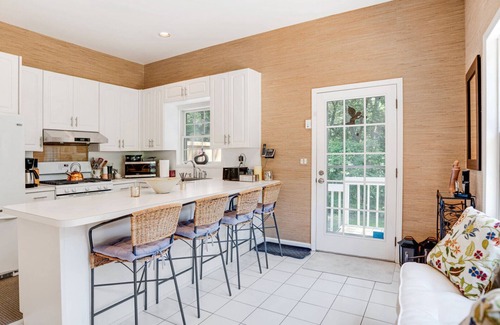 Inside, the home unfolds with a bright, airy feel, thanks to vaulted ceilings with skylights and expansive glass French doors that open directly onto the back wooden deck, creating seamless indoor-outdoor living. The open living room features a plush sectional sofa, a cozy fireplace, and a flat-screen TV, ideal for unwinding after a day of exploring. Just off the living area, the dining space flows into the chefs kitchen, which is fully stocked with modern appliances, cookware, a coffee maker, and a breakfast bar/island that doubles as a hub for entertaining. Central air conditioning, high-speed Wi-Fi, and a washer and dryer ensure your stay is effortless and comfortable.