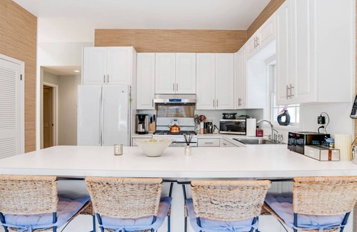 As you arrive, youll be welcomed by beautifully manicured grounds and the calming seclusion of the lush, tree-lined yard. The private heated pool is the centerpiece of the outdoor oasis, surrounded by a spacious sundeck with chaise loungers perfect for sunbathing. Enjoy shaded and sun-drenched seating areas, ideal for morning coffee or evening cocktails under the stars. A dedicated outdoor dining area with a gas grill invites you to savor alfresco meals, while the outdoor shower with both hot and cold water adds a touch of coastal luxury after a day at the beach. Multiple gathering spaces make this backyard feel like a private resortand there's plenty of free parking for your groups convenience.