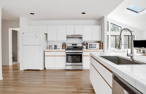 4BR/2.5BA: Private heated pool, fenced yard, outdoor dining with gas BBQ, skylights, and abundant natural light