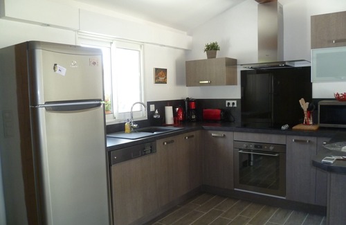 an equipped kitchen: including a dishwasher, a fridge with small freezer, an extractor hood, 1 hob, a microwave, a pyrolysis oven, small appliances and crockery for four people