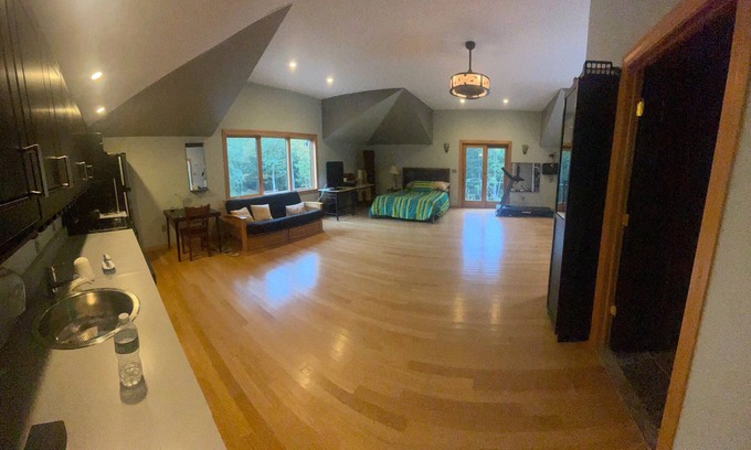 Get ready to relax in a fully independent guesthouse in a stone castle in Woodstock . This terrific property features one huge 825 sf. of loft space with full kitchen and rustic full bathroom and another spacious room with attached modern full bathroom ,with one queen bed and two queen size sofa bed, perfect for a small group of guests. Two full beautiful rustic bathrooms offer a refreshing shower body and 6 sets of water jets , bidet, heating and AC ensure a cozy atmosphere all year-round. Property is located on top of the hills of village of Woodstock with tranquilizing privacy ideally located within 5 miles from the New York Thruway 87, village of Woodstock, trendy city of Kingston, town of Saugerties and amazing town of Rhinebeck. Enjoy the country life, hunting, hiking in 50 acres of wooded land surrounding the property with stream running true with great mountain view , deer and wild Turkey nesting all around this property. Out door patio wraps around the property with 5000 sf. of stone pavers with breathtaking view of the west and east mountains, a stone query nearby with beauty of wetland are a unique features of this property , hiking trails runs through the property and continued all the way to the next town .