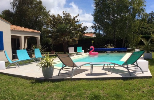 Quiet and sunny location all day on a 1500m² wooded plot 500m from shops, 2km from the port: Fort Louvois, 3km from the beach and the island of Oleron. Several possible activities: nautical, pedestrian, equestrian or even fishing. Independent house of 120m² on the ground floor. 25m² terrace, garden furniture and barbecue available. private heated pool. Parking for 3 cars. 4 bedrooms (2 with a 160 cm bed, 1 with two 90 cm beds and 1 with a 90+ bed and baby accessories), equipped American kitchen, utility room, living room, dining room, large bathroom and two bathroom.