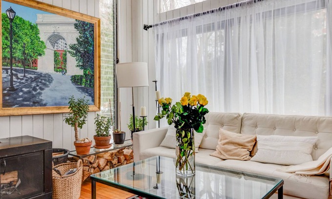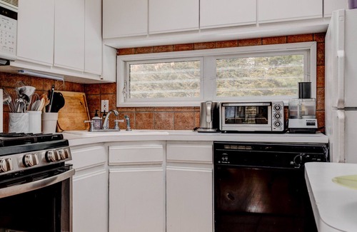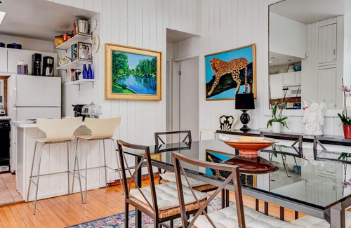 Through the gated entry, the gravel path leads you to a tranquil Hamptons retreat. The light, open main level matches effortless flow and flexible living, perfect for entertaining. Adorned with gorgeous original artworks, oversized windows and warmed by a cozy wood fireplace, this home is full of style. Multiple pairs of sliding doors open to the rear deck merging indoor and outdoor living. Prepare your favorite meals from the well-equipped kitchen including gas cooking, a toaster oven, coffee maker and breakfast bar top. Located just off the kitchen, enjoy game time or intimate dinners from the separate dining area. Relax and wind down in one of the three generously sized, main level bedrooms. Two of the bedrooms come with direct backyard access, ideal for those early mornings with your cup of coffee.