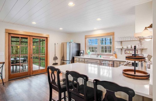 Guest accommodations include WiFi, central heating and air conditioning, a laundry room, and a main floor powder room. Hillside Cottage allows one dog per reservation with an additional pet fee. The home is accessed via a paved parking area and no-step entry to the covered front porch. AWD or 4WD is recommended for winter travelers.