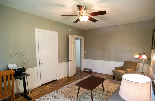 The Fourth Street House house was built in 1948, and has recently undergone a renovation that includes the kitchen and both bathrooms, the hardwood floors refinished, and the house furnished with all new furniture. The dining room has French doors that open out onto the back porch that has a beautiful view of Downtown Maysville. There is a master bedroom on the main floor, along with a full bathroom. The two additional bedrooms are upstairs, with a second full bath.