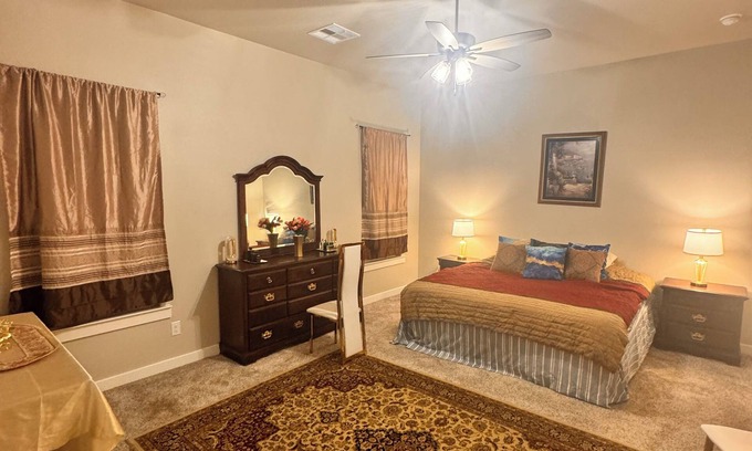 Nestled in Lubbock, this delightful house offers a tranquil escape for guests. The bedroom features a cozy king bed, perfect for a restful night's sleep. With amenities like WiFi and a fitness room, guests can stay connected and active during their stay. The bathroom includes a relaxing bathtub and a hair dryer for added convenience. Escape to this gorgeous retreat and unwind in style. We'll be available to answer any questions while you stay at our place.