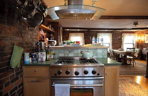 The third floor has a professional grade stove, generous space for dining, entertainment, half bath and a lovely fireplace nook. The kitchen is fully equipped with pots, cooking utensils, and appliances for a home-cooked meal.
