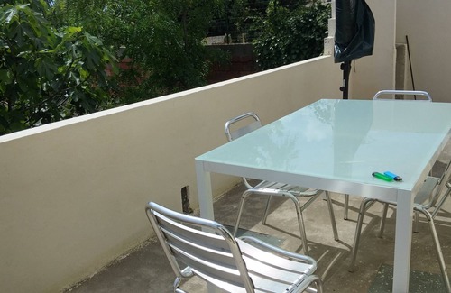 The living room is bordered along its length by a terrace of 7m x 2.5m approximately, facing south and overlooking the gardens and school yard (quiet during holidays). A small barbecue and garden furniture allow for outside dining.