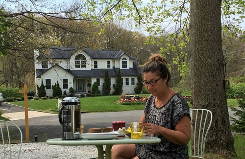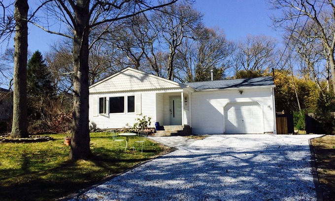 Very Quaint and Charming private home set on 1 acre of unspoiled natural wooded land. House is bright and inviting with great backyard set up to relax and entertain. Close to the Hampton and the many beaches of Long Island. Our house will be your for your all stay. They are 2 private bedrooms with queen size beds and each a private bathroom, as well as an additional bedroom with a full size bed and for more guest,a pull up bed in the living room. Garden is completely private and ideally set up to relax or entertain with Lava stone giant wet bar, infra red BBQ, outdoor shower with hot water. A beautiful space to just lay down, relax and watch the stars after a good day at the beach.