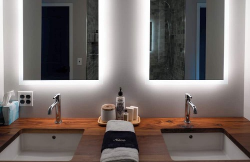 This King Suite is part of a multi suite building. Three suites are located on the second floor and are all available for booking. Guests have access to enjoy our first floor bar and lounge area during their stay. The bar and lounge area comes equipped with a handcrafted custom walnut round table and chairs. 8 barstools located at the bar island and a comfortable lounge area with a smart tv. This area also has a bathroom.