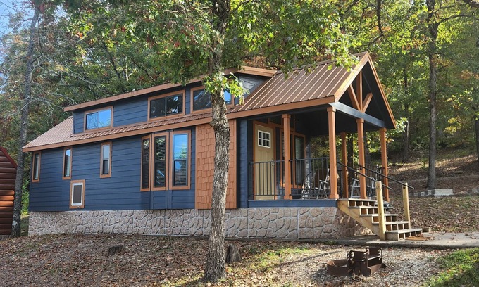 Brand new in 2021, Cabin 6 is the ultimate getaway. The earth tones add a modern touch with comfort. Like all of our cabins, it has a full-size refrigerator, microwave, coffee pot (filters included), toaster, and full-size oven with a ceramic top and 4 burners. It has one full size bedroom with a queen size bed and a loft above the bathroom that also hosts a queen size bed for a total of 4 guests. Relax on the porch under the fan and wait for nightfall to hear all of the amazing sounds of nature on the lake.