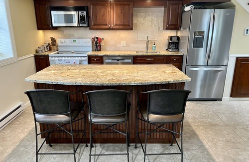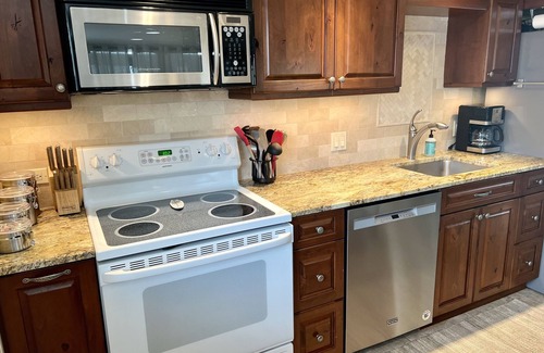 The cottage comes equipped with four single person kayaks, two paddle boards, gas grill, yard games, fire pit, firewood, beach towels, life jackets, and various water floats and toys. A fully equipped kitchen, is located just inside the porch making it easy to entertain. Coffee, cooking/baking pans and a variety of basic spices, as well as complimentary bath and laundry soaps are also provided.
