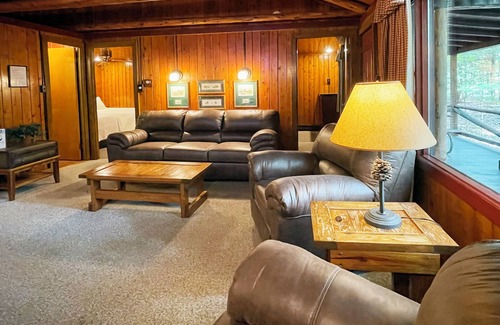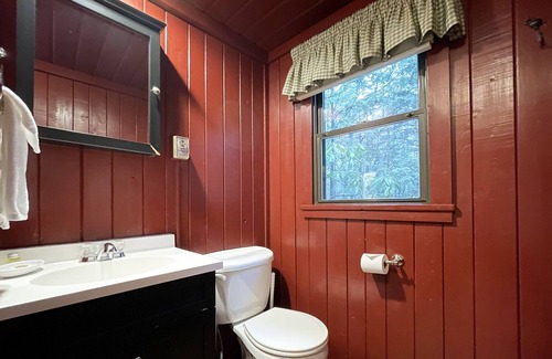 Surrounded by towering pines, lush rhododendron, and mountain laurel, this cozy cabin is the perfect retreat. Very quiet, with a stunning stone fireplace (gas fireplace, no wood needed) and covered wood porch, your cabin is also close to the beach, playground, and nature trail.
