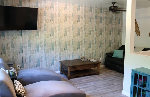 Out front there is a carport with space for at least two vehicles, as well as additional spots on the grass. Walk up a few steps to the front porch and into the front door. There is a spacious living room with two comfortable couches with two built-in recliners. Enjoy the game or access your subscriptions (Netflix, Hulu, Amazon etc.) on the 50" smart, flat-screen TV. We have an assortment of books, games and children's toys as well as brochures for local points of interest.