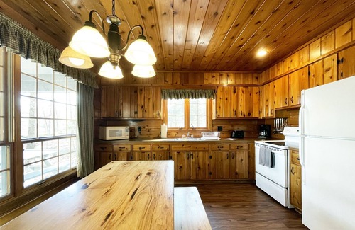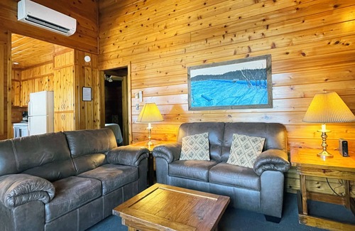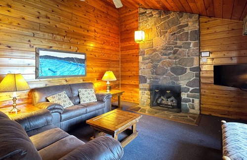 This cozy cedar cottage has a grand stone fireplace (gas fireplace, no wood needed), vaulted ceilings and a spectacular view from its covered front porch. Set in a grove of white pine and lush rhododendron, with the lake and beach at your door, your cabin is a perfect haven for couples and small families.