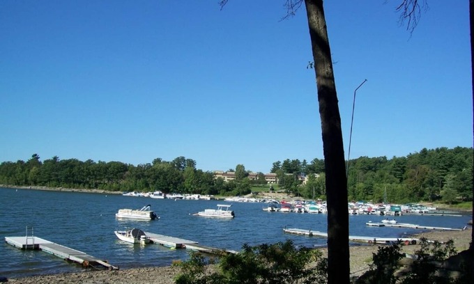 Majestically situated with rolling lawn to our own beach and spectacular views of Lake Wallenpaupack. 3 miles from Hawley, 8 miles from I-84. 2 decks, fireplace, New 50 foot dock for your boat or use our rowboat, canoe and shared paddle-boat. Full sized pool table, ping pong, board games, croquet, badminton and volleyball. Cable TV with DVD and video library, wireless Internet, paved driveway and extensive library. Washer/dryer. new barbecue, fire pit, hammock. Charming rustic decor. Fun for all ages.