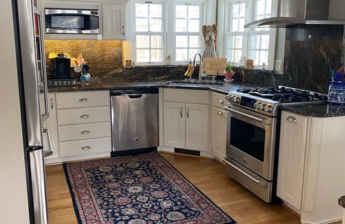 Gourmet kitchen, wrap around porch, 2 king beds, 2 Queen, 2 twin beds, 3 1/2 baths, fire pit, 1 home away from lake, air conditioning, hardwood floors, walking distance to restaurants & shopping,. Perfect for large family.