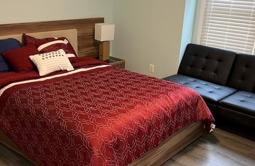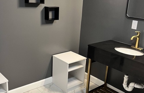 -basement has a separate entrance, refrigerator, living space bedroom and bathroom. Smart lighting and Bluetooth compatible bathroom lighting (syncs to play music)