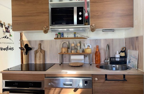 * Kitchenette opening onto the living room with dining area: ceramic hob, oven, refrigerator/freezer, dishwasher, microwave, Nespresso coffee maker, kettle, toaster, electric griddle, storage cupboards;