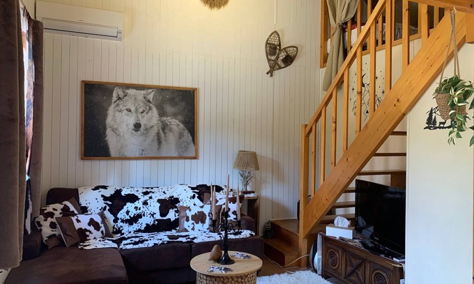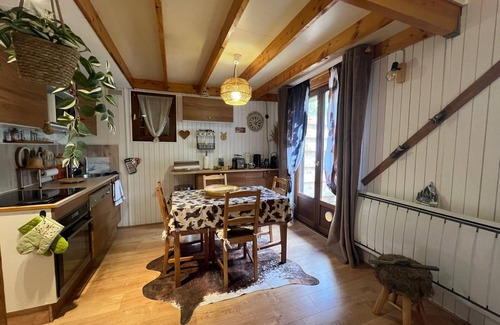 38 m² 3-bedroom chalet with a mezzanine bedroom and a cabin bedroom for 4 people. South-facing with a terrace and fenced garden, reversible air conditioning, located in a quiet residential area with a tennis court.