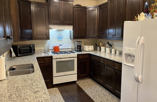 Inside, you’ll find everything you need for a relaxing getaway. The master bedroom suite and second bedroom have a cozy queen-sized bed in each bedroom. Both bathrooms feature his and hers sinks and custom stone tile showers. There is also a fold out couch in the living room.