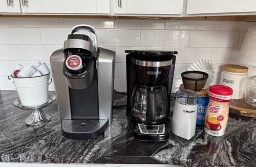 ✔ Fully Equipped Kitchen – Stainless steel appliances, cooking essentials, Keurig & regular coffee makers