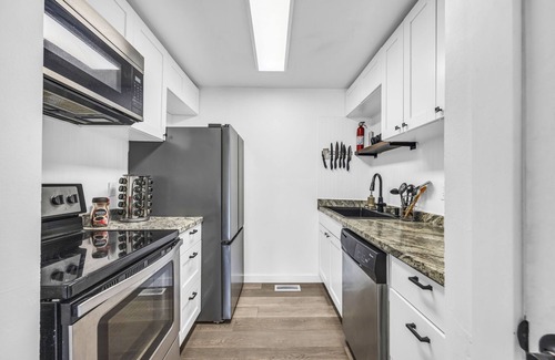 As you step inside, you'll be greeted by a spacious and inviting living area, complete with comfortable seating and a flat-screen TV for entertainment. The fully equipped kitchen features modern appliances and ample counter space, making it easy to whip up delicious meals for your group.