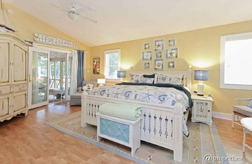 Relaxed cancellation policy due to Covid-19. Please inquire for details. Beautifully decorated studio cottage with a coastal theme. Featuring a large very private screened in porch and lush landscaping. Available for 3-4 guests with a very comfortable king sized bed and a full size sofa sleeper with new memory foam mattress. No pets allowed. The cottage has a kitchenette including; sink, microwave, small fridge and coffee maker, and dining table on screened in porch. Enjoy coffee on the porch in the morning and after a busy day in town or at the beach, relax under the stars while you roast marshmallows around the large fire pit. The cottage is a short walk or bike ride to town (2 bicycles are provided) and a 6 block drive to the beach. Enjoy all that Harbor County has to offer while staying at this adorable cottage!