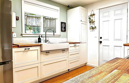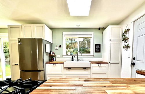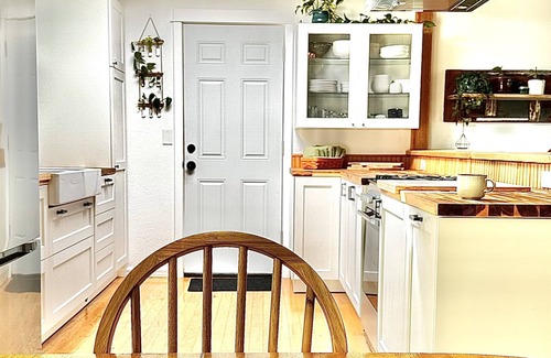 Relax with the family or your best girlfriends at this comfortable, fully furnished home. The house is on a corner lot in a quiet neighborhood where city meets country. The newly renovated main level boasts a bright kitchen with all the things one needs to prepare meals in a functional, well stocked space that has vast butcher block countertops. The 3 bedrooms each bear the theme of local landscape.......Woodland, Farmland & Island. Choose to sleep in the space that makes you most happy.