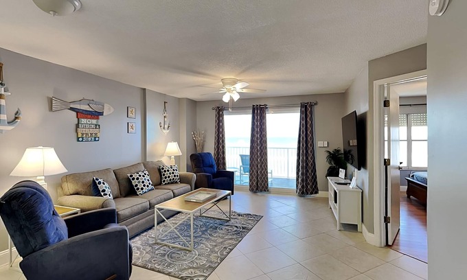 When you stay at Sea Winds 602 you'll wake up to the sound of the ocean every day. Ideal for small families or friends traveling together, this two-bedroom, two-bath condo features unparalleled ocean views, comfortable furniture and every convenience of home. Sliding glass doors make the space bright and airy, while leading you to a private balcony perfect for enjoying your morning coffee while you breathe in the salt-tinged air. Inside, stylish seating invites you to relax after a day of beach fun, you can catch up on your favorite shows via your own streaming apps on the wall-mounted smart TV or update your Instagram courtesy of the free Wi-Fi. Bond over a meal or a board game in the intimate dining area, or pull up a stool to the wrap-around breakfast bar! Don't let the kitchen's compact size fool you…it's equipped with everything you need to prepare a meal of fresh local seafood. You can even whip up a couple of daiquiris!