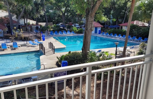 Our Villa is situated in an Enchanting Oceanfront Resort Complex of privately owned Villas on the northern end of historic Jekyll Island. The pool is right outside the back door. The kiddie pool, snack shack, gift shop, lounge, and restaurant are all in the same area. This 2 bedroom, 1 and 1/2 bath unit can accommodate up to 6 persons. The master bedroom is upstairs and overlooks the pool and has a queen bed. The 2nd bedroom just down the hall has 2 Extra Long twin beds. Downstairs you will find a large well equipped kitchen, 1/2 bath, dining room and beautiful family room with great pool view. Large sofa folds out to a comfortable Queen bed. (not your grandma's sleeper) Perfect for families with children.