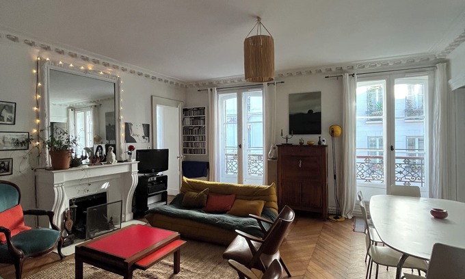 Haussmanian apartment with charm of the old: Parquets (squeaky!), period moldings and fireplaces.
