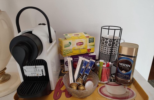 Kitchen with Nespresso machine, microwave, electric plates and fridge.
