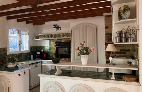 An open Provencal kitchen equipped with a dishwasher, electric hob, extractor host, oven + microwave, coffee maker, kettle, etc ... children's high chair.