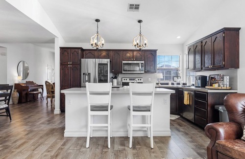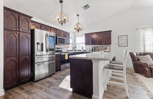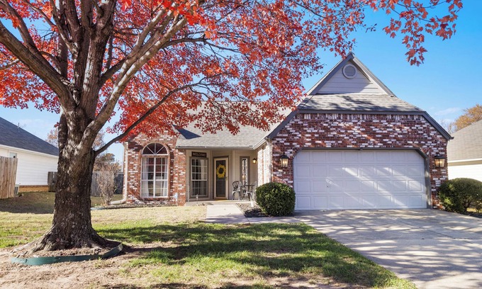 This beautifully updated & interior designer decorated home is situated in a popular & convenient South Tulsa neighborhood. This lovely, cozy home boasts 3 inviting bedrooms, including a private Primary Suite with King bed & spacious private bath, a second king suite & queen bedroom suite which are down a private hallway & share a full bath. You will find 2 spacious living areas each with a gas log fireplace, lovely large dining area & updated kitchen with center island snack/prep counter perfect for gathering your family & friends. The primary suite is off the back living area & boasts a huge private bath with jetted tub & separate showers with his/hers sinks & closets - luggage racks in each bedroom plus hangers in closets. The two spacious guest suites are located down a private hallway off the front living room and host cozy spaces, luxury bedding & large closets. Also conveniently located near the laundry room, the guests share a large full bath stocked with hair dryer, soaps, shampoo/conditioners, & plenty of fresh towels. The front living area hosts a piano, large screen smart TV, gas fireplace, reading nook & game table. The fully stocked kitchen is open in the vaulted living space with all cooking utensils & amenities including fridge, microwave, stove/cooktop, Kuerig coffee & electric hot water pot, all the pots & pans needed, plus serveware for hosting. Coffee mugs, wine glasses, whiskey tumblers and such will keep your guests & families happy during your stay. NEW Central HVAC & hot water tank, new washer & dryer, plus fully remodeled finishes with WiFi included. Whether you're needing a short stay or to book a long-term lease or insurance-related housing, we are experienced in meeting the needs of our guests! OR a perfect weekend getaway & an amazing retreat, this enchanting property is the perfect choice for your next vacation. We'll be available to answer any questions while you stay at our place.