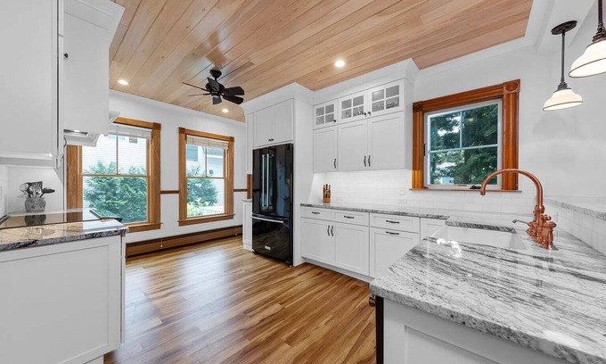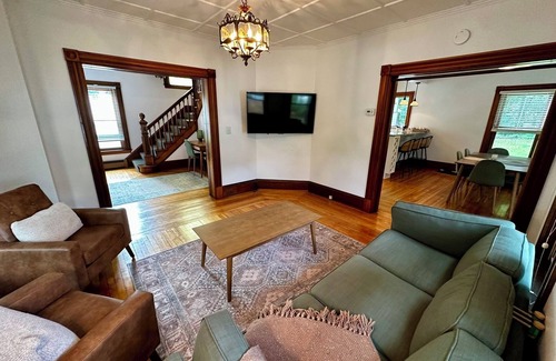 The Tide & Trail Village House is a recently renovated 3 bedroom 2 and 1/2 bath farmhouse in the heart of Camden, Maine. Walking distance to all of Camden's shops, restaurants and attractions, this is the perfect launching point to explore the town where the mountains meet the sea. With 1 king bed, 1 queen bed, and 1 double bed guests will find plenty of comfortable sleeping space. Starting in 2026, we will also have a twin trundle for those parties that need it. Enjoy WiFi, a washing/drying machine, and AC during your stay.