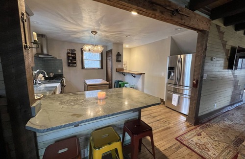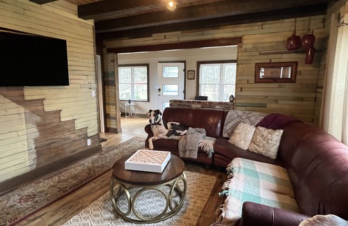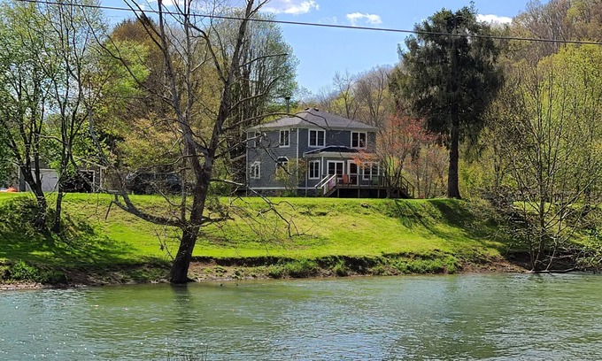 A slice of heaven with this completely custom farmhouse mixed with its original charm. Whether you want to spend time in the river kayaking, tubing, fishing or just plain floating with your cocktail in hand, this place is on the river and equipped with all these fun options. If you'd prefer more land-based fun go hiking, pick wildflowers, hang out by the bonfire or relax in the hot tub overlooking the river.