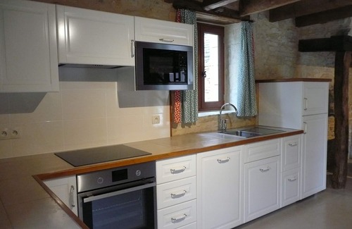 Downstairs, the accommodation comprises a large open-plan living/dining room with a brand-new fully-fitted kitchen. Next to the living room, what was once a pigsty has been extended to create a double bedroom with a king-size (150 cm) bed, plus an en-suite bathroom (shower, basin and toilet). Upstairs, there is a very pretty, spacious bedroom with pine-panelled ceiling, two single beds and another large en-suite bathroom. The cottage is ideally suited to 2 couples or a couple with children. Guest comfort is one of our most important priorities: most of the furniture is new - but solid oak in keeping with the character and age of the home - mattresses are high-quality, towels are fluffy Egyptian cotton. Heating in the cooler months is provided by electric radiators, and there are heated towel rails in both bathrooms.