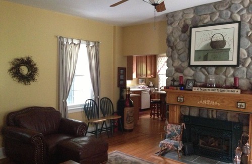 This beautifully appointed property is an older mini-mansion which offers a serene porch with rocking chairs and cozy firepit for evening gatherings, perfect for a relaxing getaway.