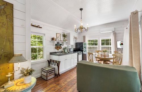 This cozy studio cottage adapts beautifully to your getaway — whether you're planning a romantic retreat for two 💑, a mindful solo escape 🌿, or a peaceful hideaway with a little one 👶. Inside, warm rustic touches and soft lighting create an inviting atmosphere. The open layout features a queen bed 🛏️, a fold-out loveseat 🛋️, and an electric fireplace 🔥 that adds both warmth and ambiance. The fully equipped galley kitchen 🍳 and dining table make it easy to share simple meals or morning coffee, while the newly added hot tub ✨ is perfect for unwinding beneath the stars.