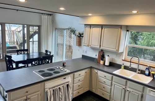 Full sized kitchen perfect for cooking and fully equipped for any gathering - including serving dishes and utensils! The "perfect kitchen" with sink/fridge/oven all within steps.