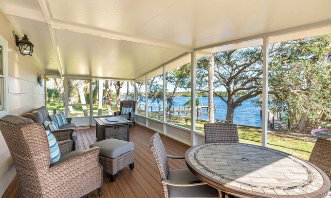 The Riverside Cottage is one of four luxurious, entirely private residences situated on a 1.7-acre resort-style property. The property features picturesque landscapes with three docks, ideal for mooring boats and fishing. Mature oaks and breathtaking river views enhance the ambiance.