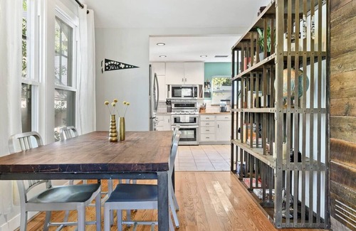 Retro meets modern in this vintage-inspired bungalow located in the heart of East Austin. The backyard offers dreamy Austin vibes with multiple hangout spots including an 8' Cowboy Pool, fire pit, hammock, and rustic dining area under a pergola with string lights. There's even an air stream for decor!