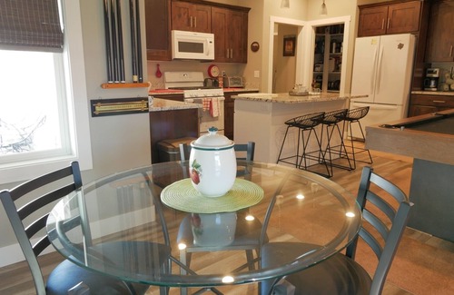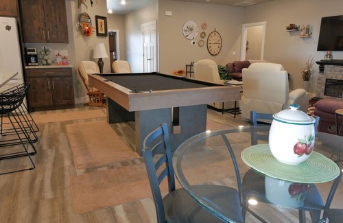 The large great room features a large screen smart TV, a gas fireplace reclining chairs, and a pool table. This is the perfect place to gather with your loved ones to watch a movie, play games, or simply enjoy each other's company.