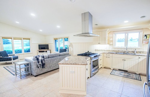 The full-size kitchen is fully equipped with all the essentials, including pots, pans, a baking sheet, and utensils. Modern appliances include a traditional coffee maker, gas stove, refrigerator, freezer, microwave, dishwasher, and toaster. For outdoor cooking, there's a gas grill ready for a BBQ.