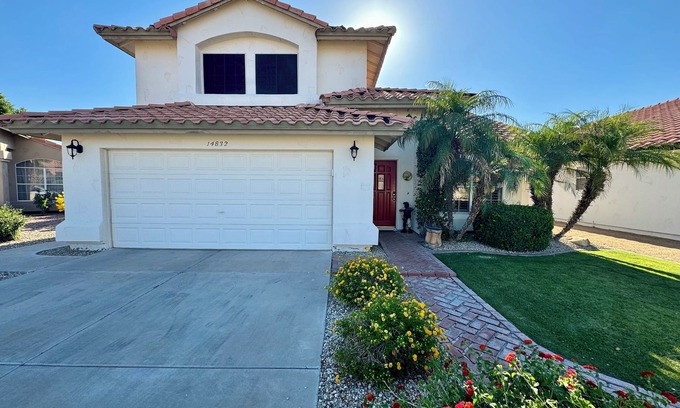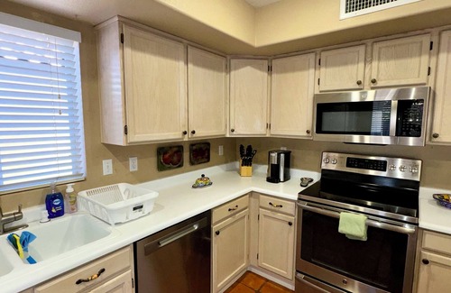 This beautiful two-story, nestled in a quiet neighborhood, is 2100 sq ft of perfect vacation property. Embellished in a relaxing Southwest style, the main floor has vaulted ceilings, Saltillo tiling throughout and kitchen with spacious center island. Kitchen is fully stocked with a variety of kitchenware and basic cooking supplies with brand new stainless steel refrigerator, dishwasher and microwave. Enjoy over a 100+ channels with live TV with DVR recording services in both the family room and master bedroom. There is a powder room on the main floor, as well as a well-stocked separate laundry space.