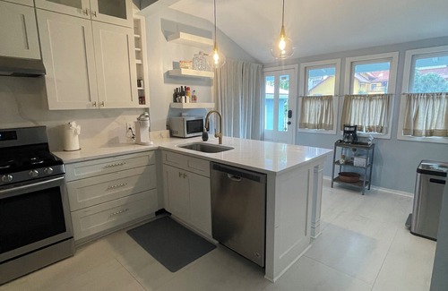 - Newly renovated spacious kitchen is bright and open to the family room and the back courtyard, and stocked with everything you'll need to cook a great meal or enjoy a nice cup of hot (or iced) coffee - includes a gas stove, designer appliances, beautiful quartz countertops, pantry, dishwasher, and washer/dryer closet
