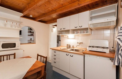 The studio consists of a living room with a couch (double bed), a gallery with a double bed, a equiped kitchen wih fridge, cooker, microwave, and a bathroom (shower with toilet).