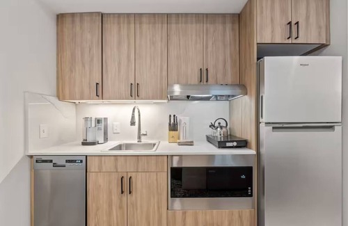 ✦ Each room is 312 sq. ft, equipped with complimentary toiletries, kitchen with basic amenities, high definition 43-inch TV, available with Roku, ensuring cleanliness and comfort throughout your stay.